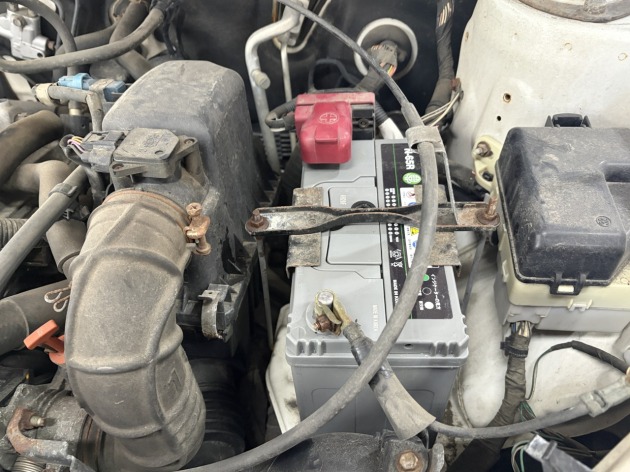 リビルトのオルタネーターを取り付けファンベルトを貼り、新品バッテリーに交換しました。