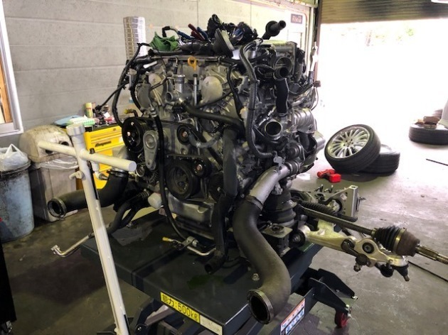 エンジンを下さないでの作業も可能といえば可能ですが、あまりにも整備性が悪いので、エンジンを脱着することにしました。