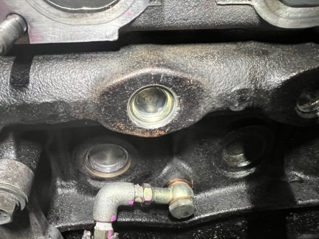 リフトに上げて点検するとエンジンブロックのエキゾースト側のメクラキャップからクーラントが漏れていました。
