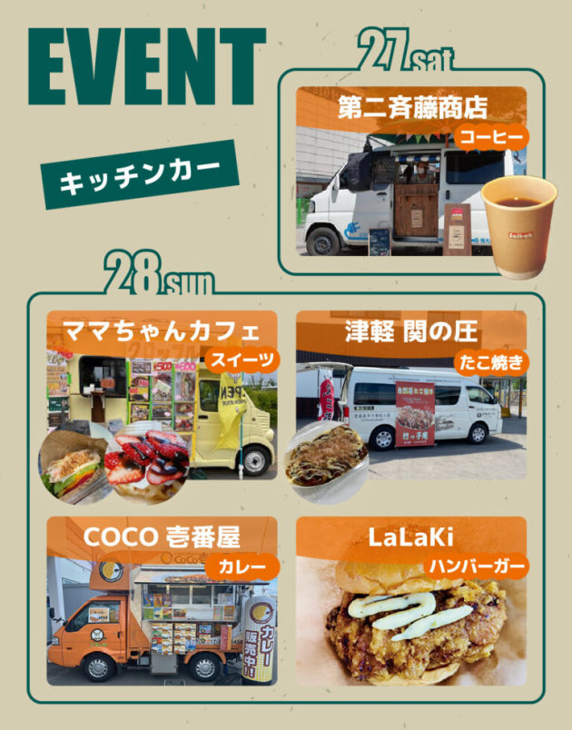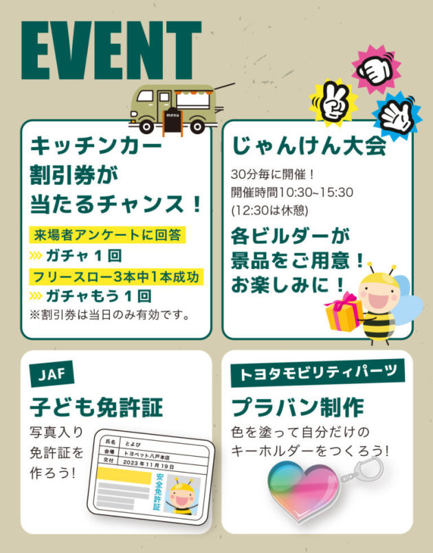ハイエース展示のほかにも、キッチンカーの出展やワークショップ、各メーカーのアイテムがもらえるじゃんけん大会など、楽しい企画が盛りだくさん!