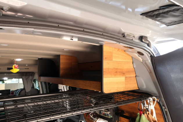 サイドトレーはハイルーフ車に取付けることができる施工となっていて、今回は運転席側天井にトレー2つ連結させてカスタム!デッドスペースになってしまう天井部分にトレーがあることで、寝袋や着替えタオルなどなど、ベッド上に置いたままになりがちな収納したいけどすぐ手に取りたい荷物をまとめてしまっておくことができます!