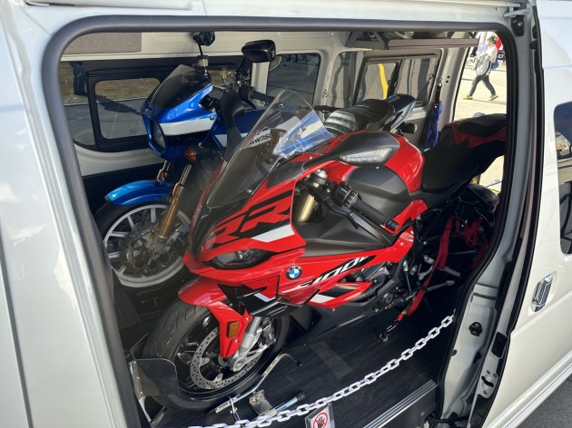 室内はバイクリフト取付けと床貼り施工を行ったトランポ仕様で、今回はカワサキZRX-1200RとBMW S1000RRを積載しました。