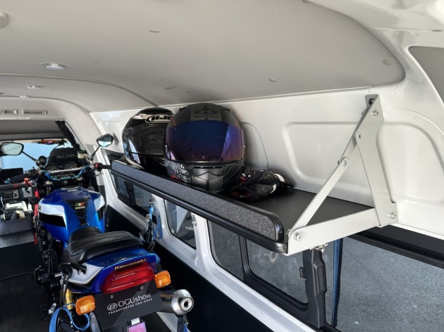 荷室にバイクを積載していると小物の収納スペースがない...、ヘルメットなどは床に置きたくない...そんな悩みごとを解決するためにカスタムしたのはハイルーフ車専用のESフリップトレーになります!