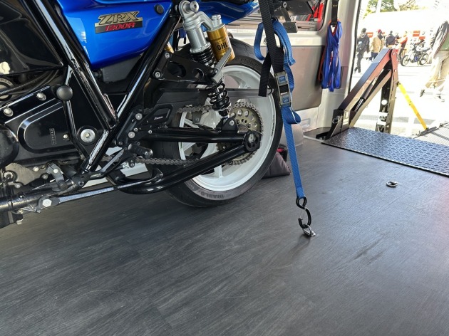 積載した車両はカワサキ「ZRX-1200R」とBMW「S1000RR」の大型2台!スーパーロングワイドボディであれば大型バイクも2台積載が可能です。