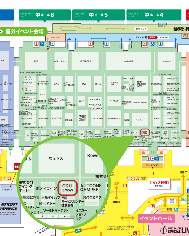 今回オグショーは中ホール4ブースNO.458へ出展。画像赤丸部分、日産サービスセンターさんの横になります。