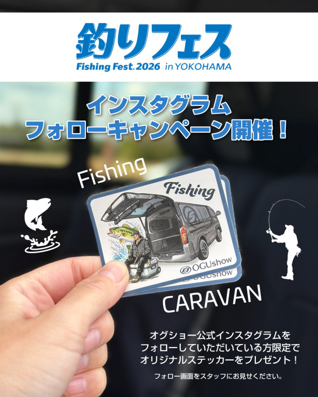 今週末にパシフィコ横浜にて開催される「釣りフェス2026」オグショーは日産ブースにて釣り仕様にカスタムされたキャラバンデモカーを展示!ブースではキャラバン最新パーツカタログを配布するのはもちろんインスタグラムフォローキャンペーンを行います!