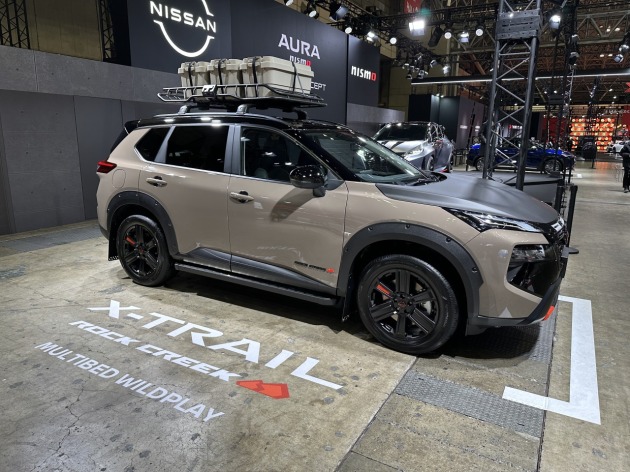 実際にアウトドアグッズを積載したり、外装カスタムでタフギア感が強まったエクストレイルがブース内で目を引いていました。