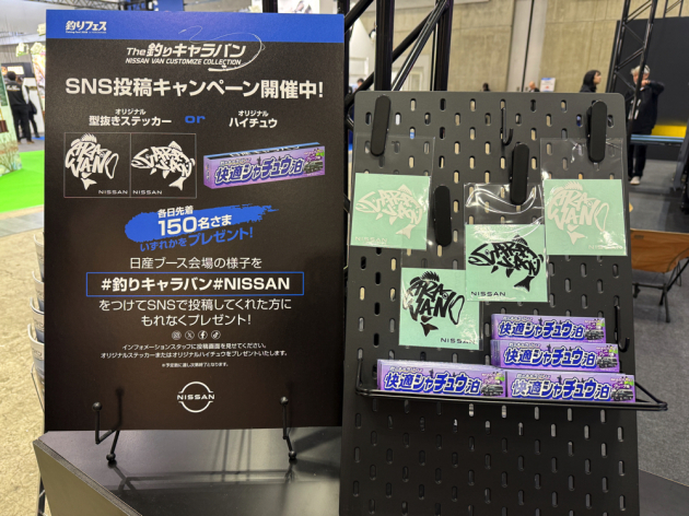 「釣りキャラバン」「Nissan」のハッシュタグをつけてSNS投稿すると、オリジナルステッカーや快適車シャ"チュウ" 泊仕様のハイ "チュウ"をプレゼント!