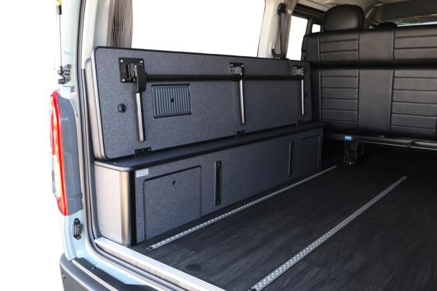 フリップベッドのベッドマット下部分にギャレーを製作、全面ベッド展開もできギャレーが必要な時はベッドマットを取外すことで簡単に展開が可能!