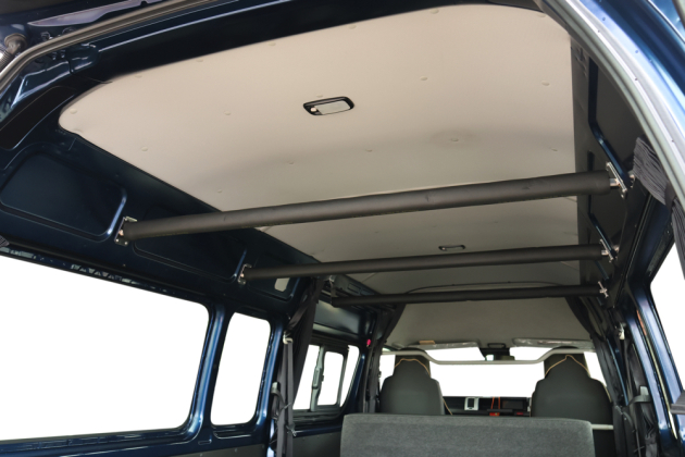 天井の3箇所にラックを取付けることで、ロングボードの積載にも対応。ボードを積んだ状態でも室内空間をしっかり確保できるため、快適に車中泊を楽しんでいただけます。