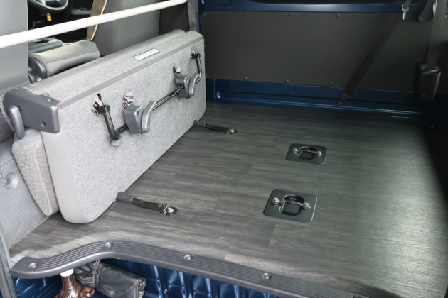 車中泊仕様のベッドには、ESフリップベッドを採用しました。跳ね上げ式の構造で、全面展開・片側展開・収納状態の3パターンへ切り替えが可能なため、用途や就寝人数に合わせて柔軟にアレンジできます。