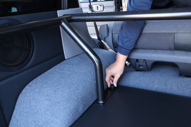 フロアパネルと車両の穴位置を合わせながら、荷質のサイドにベッドフレームを置きます。