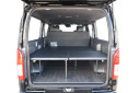 200系ハイエースS-GLワイドボディミドルルーフ:ファミリー・車中泊 「少し大きなキャンプ道具を積載したい」というお客様のご希望を形にしたオーダーベッド、ベッドの下はクーラーボックス等も収納ができる