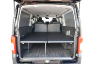 セカンドシートの後ろ全面に装備したのは片側フリップタイプのベッドです。ベッドの長さは約1800mm確保されているため、大人2人小さなお子様であれば2人就寝する事が可能です。 マットは3分割されており