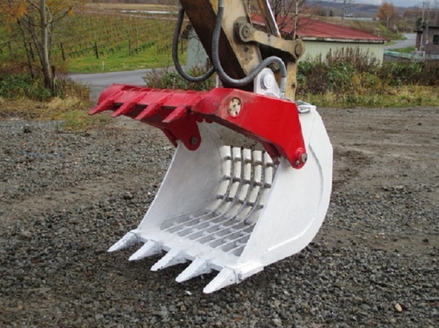 この機械は、従来のスケルトンバケットに比べ2倍以上のふるい作業処理能力と、含水比の高い土砂等に於いてもふるい作業ができるように設計しました。又、フォークとしても使用できる1台2役の強制ふるい兼用フォークです。解体工事などハードな現場でも対応できるよう強化バケット構造とし、強力シリンダー2本によりグリップ力も高めてあらゆる物を掴めるフォークとしても使用できます。