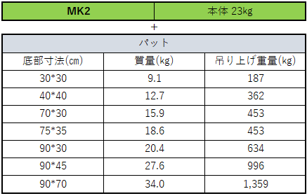 持ち上げる物の大きさや重量により、機種・パット寸法を選定できます。