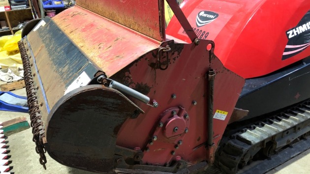 このモアヘッドカバー(安全カバー)部のスプリング(バネ)は、後継機のZHM1520とは線径と全長が異なります。ZHM1520で使用されているスプリング(バネ)を途中でカットして端部を加工する事で流用する例もありますが、強度不足により耐用時間が短くなるため交換回数が多くなります。又、針金やターンバックルなどを代用している機体もよく見かけますが、モアヘッドカバー(安全カバー)が草丈によっては上手く機能しない場合も多くあると聞きます。