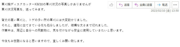 2019年より機械の部品などご購入頂いている宮崎県延岡市のお客様より草刈ディスクカッター「カッターマンKM30」のご感想を頂きました。これからもよりよいサービスができるよう誠意取り組んで参ります。いつもありがとうございます。