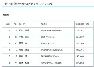 24時間走に於いて250㎞以上走るためには休みなく走り続けたと仮定した場合、1㎞当たり5分45秒で走り続けるという計算になる。これはフルマラソン(42.195㎞)に例えると4時間02分でゴールするタイムで走り続けるということだ。250㎞は大きな壁であることは間違いない。
