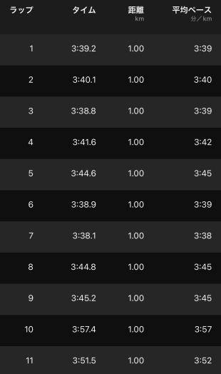 計画ではスタートから折り返し地点までは概ね3'40"/㎞とし、以後3'35"/㎞とした。