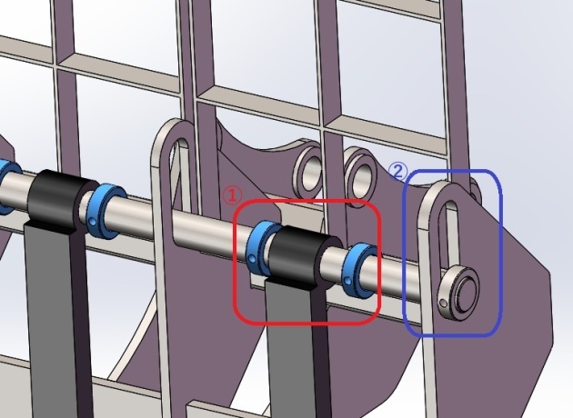 フォークに可動部位(下画像内の①と②の2か所)を設け、一定のクリアランス取ることにより従来よりも作業軽減が図られる。