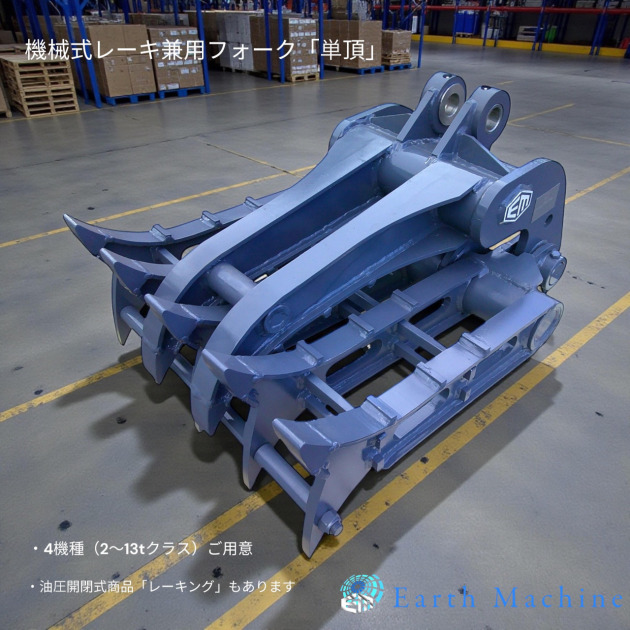 「機械式で、レーキとして集積作業をしながら、積み込み用フォークとして利用できるアタッチメントが欲しい」との声に応えて設計・開発した製品が、レーキ兼用フォーク「丹頂」です。 取り付けする油圧ショベル(バ