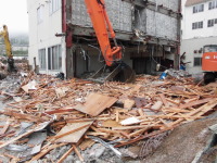 0.7m3つかみバケットが解体現場で活躍中! 今や専門解体業者、産業廃棄物処理業者の必須のアイテムのフォーク兼用バケットの「ピラニアバケット」。 2本の強力シリンダーが内蔵され、コンクリート殻や鉄筋