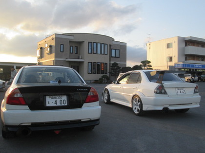 CP9AランエボⅤ 2台揃ってご来店! 2014年9月28日 K様のエボⅤとY様のエボⅤがご来店です。街中を走っていると、よく間違えられるこの2台ですが、並んでみると結構違います。フロントはカナードのあるなしが大きなポイントv向かって左側のY様のエボⅤはRS、左側のK様のエボⅤはGSRです。ま~外観は同じですけど。後ろから見るとY様はヴォルテックスのGTウイング付き。K様はミラージュの黒ボンネット。まるで別の車です。皆さん、間違わないでね~。