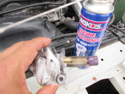 WAKOSエンジンコンディショナーを吹き付けカーボンが溶けるまでしばらく放置しておきます。