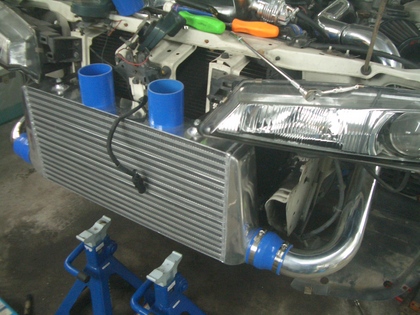 インタークーラはオリジナル物。ピカピカのバフ掛けパイピングとセットで取付けします。