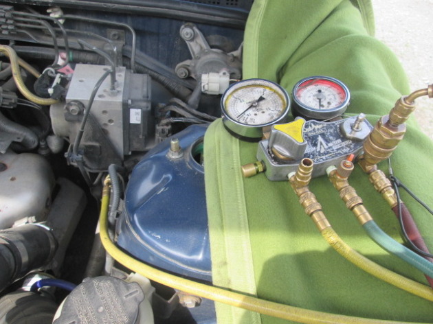 今年になってエアコンが全く効かなくなったK様のS15シルビアのエアコン点検です。まず、ガスの圧量を確認・・・・圧力0。ガスが全部抜けています。去年まで冷えていたとゆうことなので圧力0はガス漏れの証です。