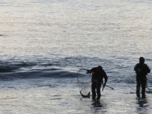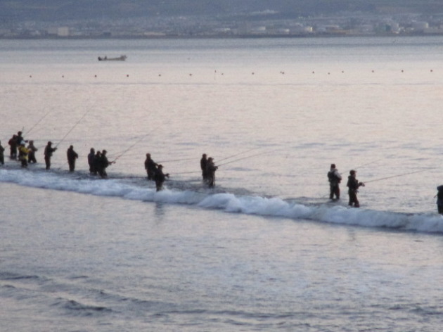 膝上まで海につかり、磯場の先端から函館山に向けて竿を打ち込む寒さと根性の釣りです。