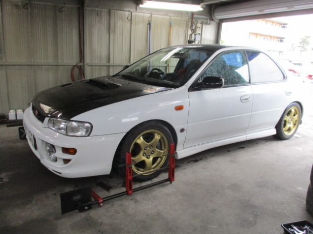GC8インプレッサの整備点検と車検上げが完了! 2016年6月8日 GC8インプレッサの整備点検と車検上げが完了しました。車検上げに際し、ライト類の交換・排ガス対策・ライト光軸調整・車高調整・フロントアライメント調整などの作業がはいりました。本日納車です。この度は、ありがとうございました。