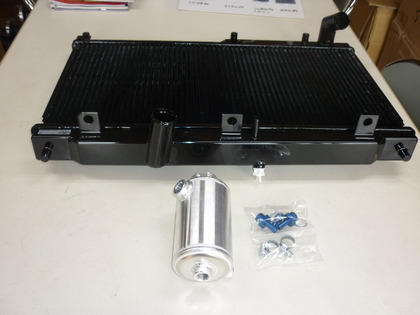水温上昇、エンジンルームの熱で 変形、破損しやすい純正の樹脂製サブタンクを容量の多いアルミ製に交換しておくとハードな走行の後でも安心!