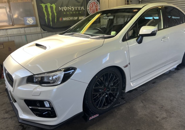 スバルWRXを冬仕様の車高へ調整&持ち込みで純正マフラー戻し!