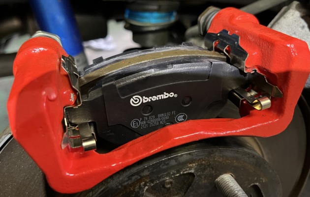 塗料乾燥後に、持ち込みのブレンボブレーキパッドを取り付けて車両に組み付けます。