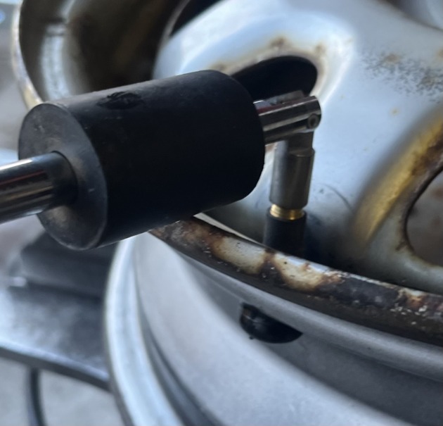 車両からホイール/タイヤを外し、一旦ホイールからタイヤを脱がしてゴムバルブを確認します。