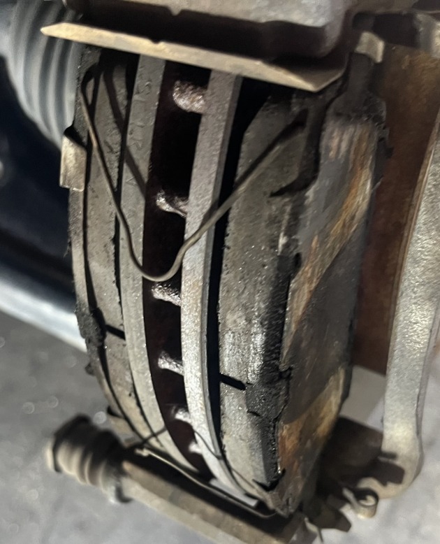 そして、ブレーキパッドの残量はあるか?ディスクローターは劣化していないか?ブレーキキャリパースライドピンの動きは問題無いか?チェックします。