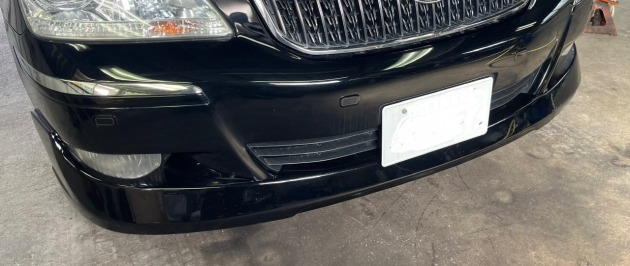 トヨタクラウンマジェスタのフロントスポイラーが外れかけて緊急入庫です。