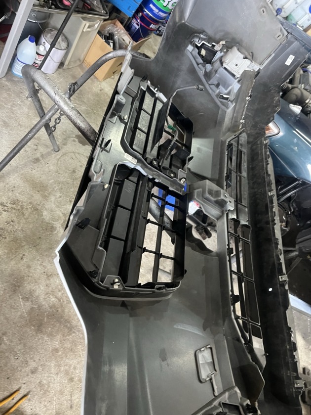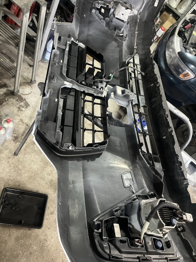 フロントバンパーはリサイクル品を手配し、付属品を移設します。
