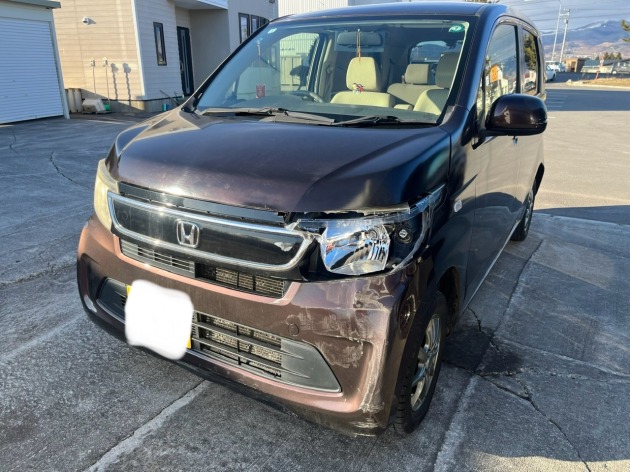 ホンダNワゴンにお乗りのご依頼者より自損事故で中破してしまった、左ライトとグリルの交換ご依頼を受け、入庫しました。