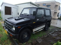 F様のJA11Vジムニーの外装塗装 交換作業が完了しました。 曲がったフロントバンパーの交換 同じく、曲がったリヤバンパーの交換 中古部品をボディーカラーの黒に合わせて黒半ツヤ塗装をして