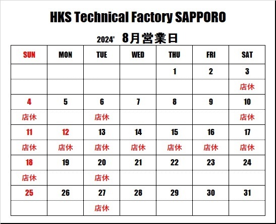 HKSテクニカルファクトリー札幌 8月営業日のご案内