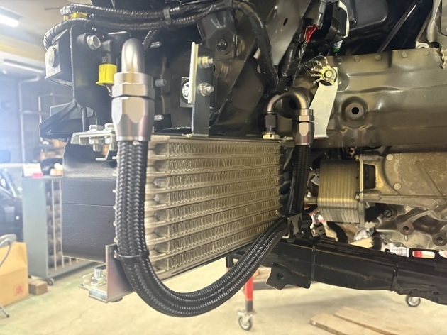 オイルクーラー本体は、左インナーフェンダー内部に取付けするタイプになるので、水温やエアコンへの影響が少なく全てが効率よく冷却できます。