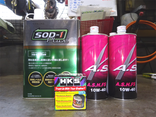 スバル インプレッサスポーツワゴン STI GGB EJ20 オイル交換入庫しました。 A,S,H FS 10W40 交換 SOD-1 200㏄ 添加しました (;^ω^) 【先日修理した エアコン