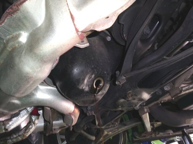 スバル レガシイツーリングワゴン BH5 EJ20 オイル漏れ 点検 入庫 (^◇^;) リフト上げ エンジン下から 見てみると... オイル漏れ箇所が多数あり 特定出来ない (゜o゜;) とりあえ