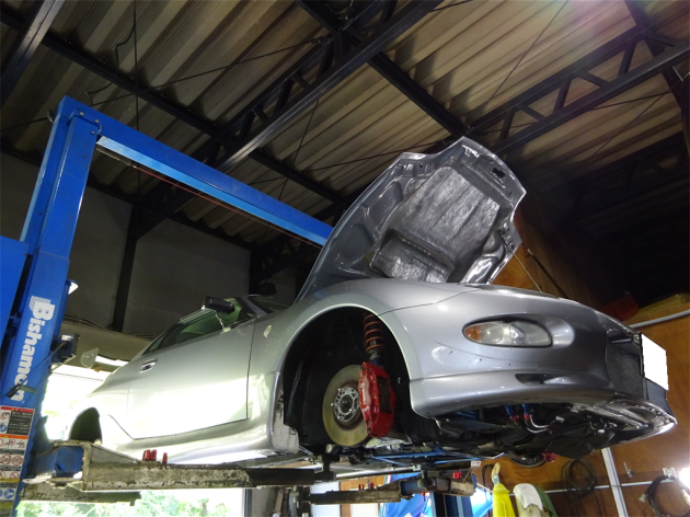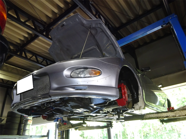 三菱 FTO DE3A 6A12 オイル洩れ修理&タイベル交換が終わり 待機してましたが... やっと FTO PITへ リフトに上げられました (^。^) エンジン 搭載が始まり... 載りました