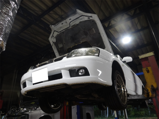 スバル レガシィ B4 BE5 オイル交換&ブレーキ点検 ノックスメンテ 終了ですが...? レガシィ B4 エンジン・ミッション・デフオイル 交換 入庫! ロイヤルパープル Gear ミッション 7