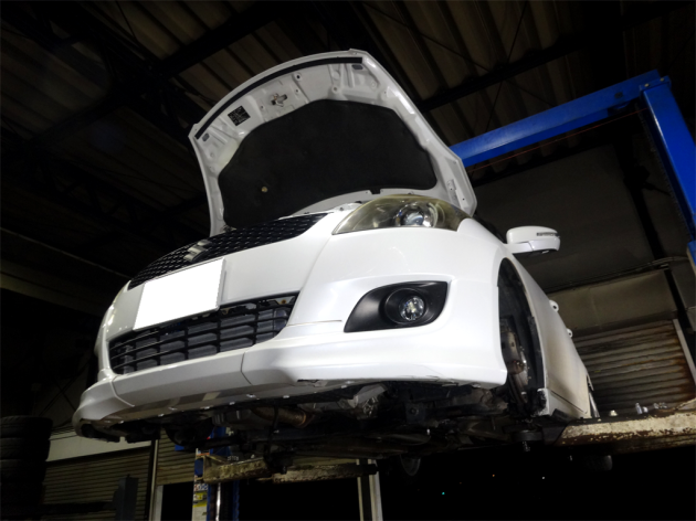 スズキ スイフトスポーツ ZC33S K14C 入庫しました (^_^) リフトに上げ フロントバンパー 取り外し... 40th フェアーでお買い上げの Greddy インタークーラーキット 取付