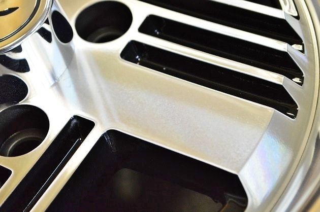 塗装を剥離し、ディスクのスリット部分をブラックで塗装、インナーと側面を回転研磨で素地研磨肌にし、インナーと側面をパウダーコートクリアー塗装です。